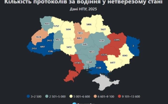 В Україні за 2025 рік виявили понад 138 тисяч випадків водіння у нетверезому стані. Найбільше п’яних водіїв зафіксували у Дніпропетровській області – 13 519 протоколів.