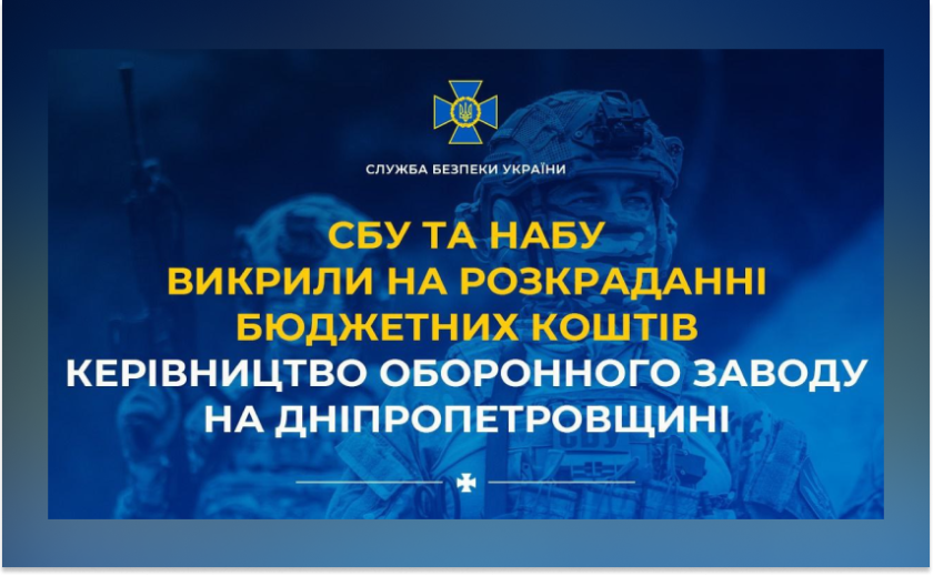 Співробітники Служби безпеки України та Національного антикорупційного бюро викрили схему привласнення бюджетних коштів під час виконання оборонних замовлень. У протиправній діяльності підозрюють керівництво стратегічного підприємства оборонно-промислового комплексу на Дніпропетровщині.