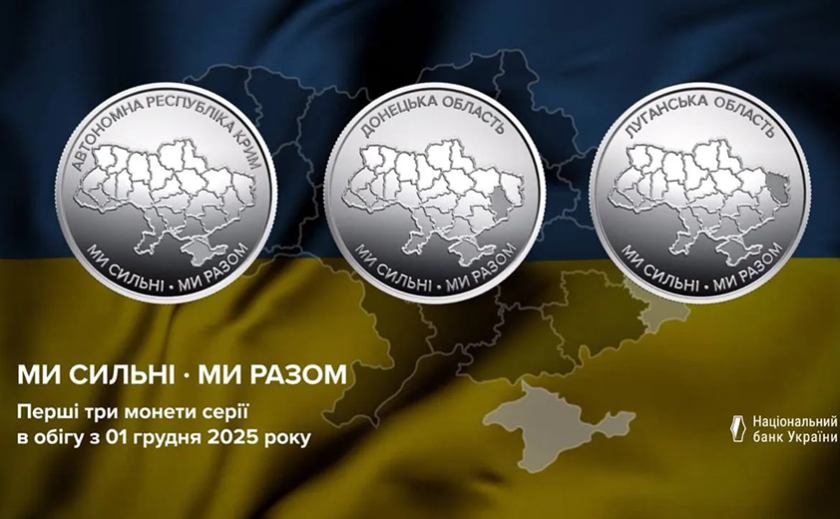 Національний банк України запустив нову тематичну серію обігових пам’ятних монет під назвою «Ми сильні. Ми разом». Вона присвячена Автономній Республіці Крим, Донецькій та Луганській областям.
