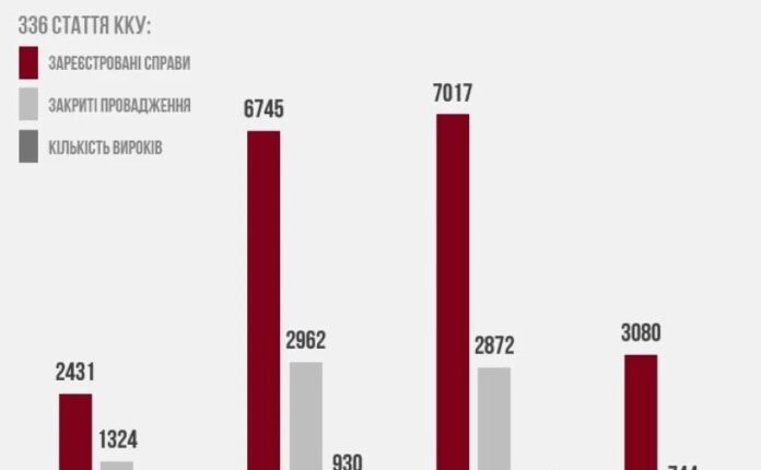 За даними Офісу генпрокурора, у період з січня 2022 по вересень 2025 року правоохоронці зареєстрували 19 273 справи за статтею 336 Кримінального кодексу України.