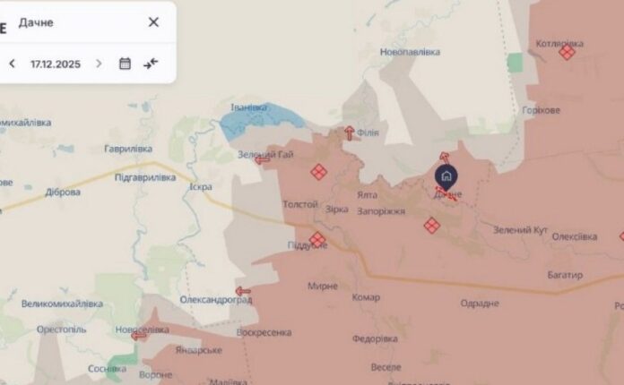 Події Ворог просунувся поблизу Дачного на Дніпропетровщині – DeepState 18.12.2025 18:30 Армія рф просунулася в районі межі Дніпропетровської та Донецької областей.