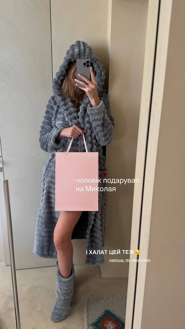 Вона опублікувала сториз, на якій постала в теплому сірому халаті та з рожевим пакетом в руках.