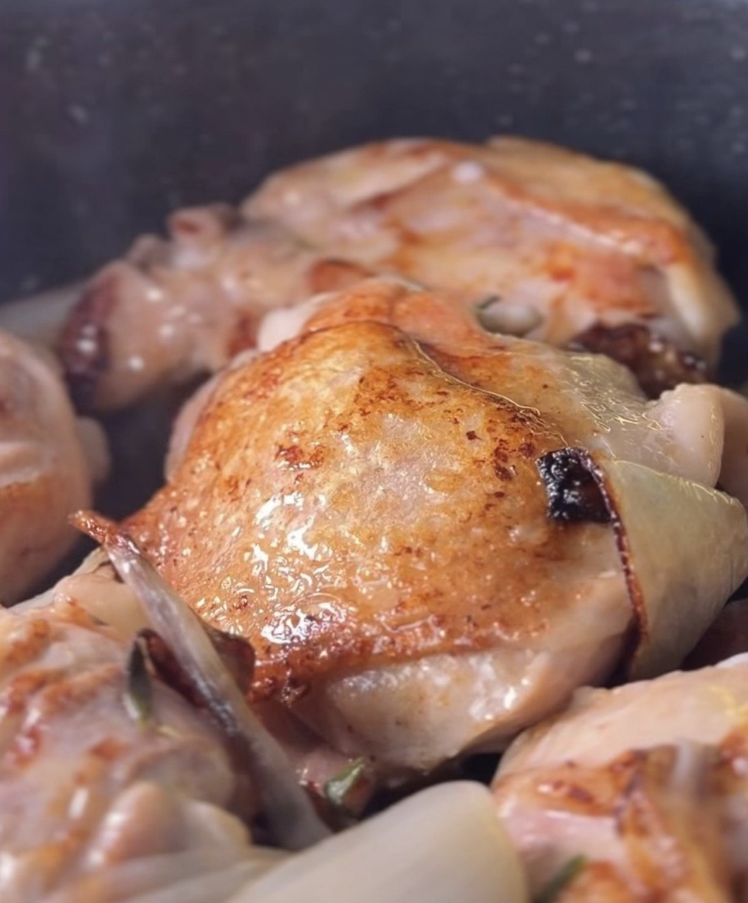 На розігріту сковорідку викладіть нарізану великими шматочками цибулю та розмарин. Далі викладіть курку та обсмажте до золотистої скоринки.