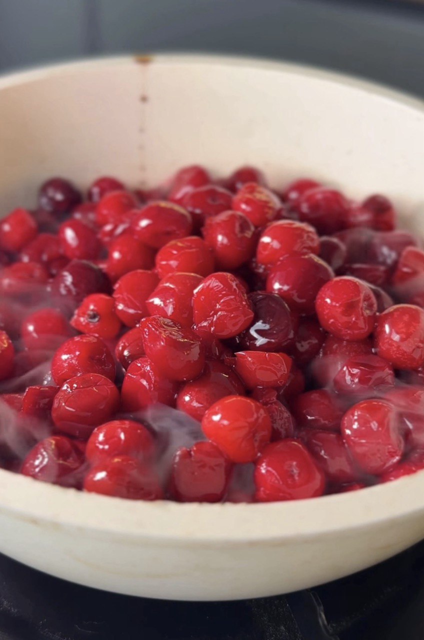 В сотейник висипте заморожені вишні та готуйте поки не пустять сік. Після цього влийте бальзамічний оцет та мед. Готуйте до легкого загустіння.