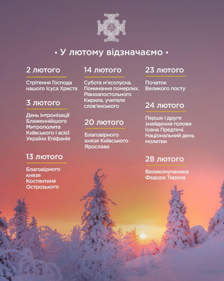 У прес-службі ПЦУ у Facebook нагадали, що лютий – найкоротший місяць у році за кількістю днів, але багатий на знакові події, свята та дні пам'яті.