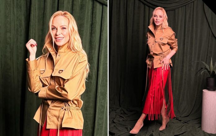 Комбінація червоного та пісочного, рухливості бахроми та структурованості карго-куртки створює баланс між елегантністю та зухвалістю, який ідеально підходить для весняних прогулянок чи світських заходів.