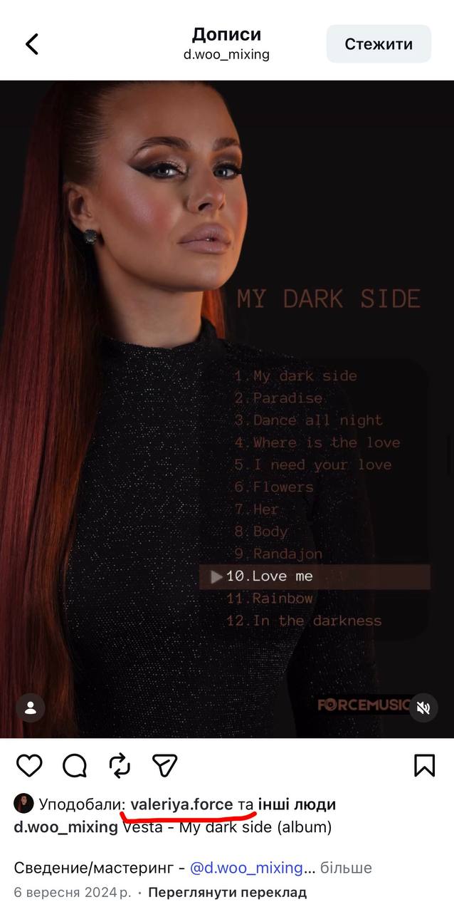 Також користувачі помітили, що у 2024 році, коли Valeriya Force випустила альбом "My Dark Side", D.Woo нібито публікував у своїх соцмережах інформацію про цю платівку.