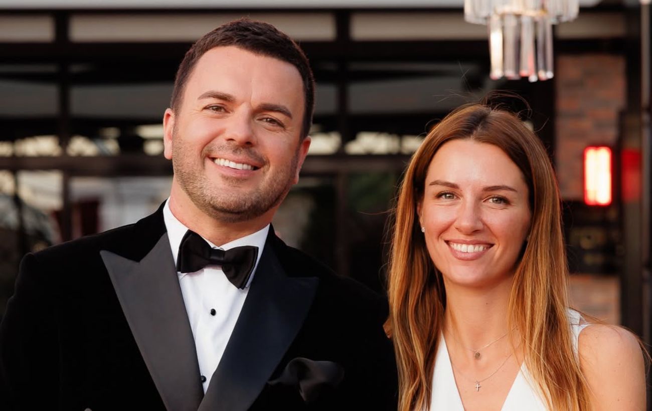 Григорій натомість обрав елегантний, але простий образ: біле поло та темні штани, які гармонійно доповнили образ дружини.