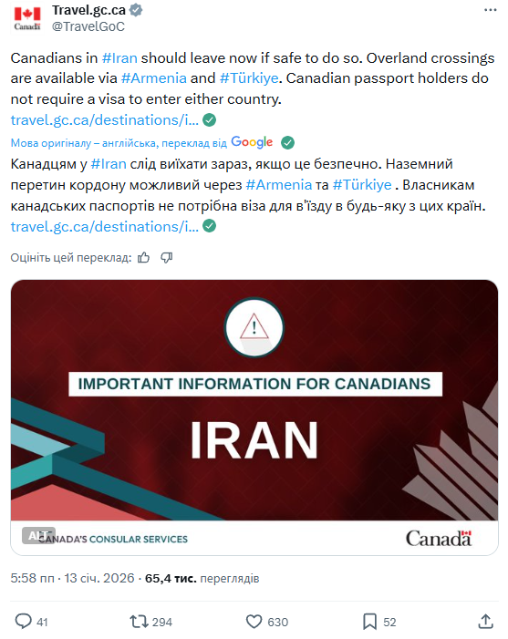 МЗС Канади терміново закликає своїх громадян залишити Іран через загрозу безпеці, рекомендувавши виїзд через Вірменію або Туреччину.