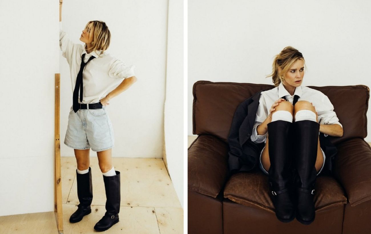 З-під високих чобіт визирають білі трикотажні гольфи, злегка приспущені. Це відсилання до преппі-естетики, яка вже кілька сезонів залишається в тренді.