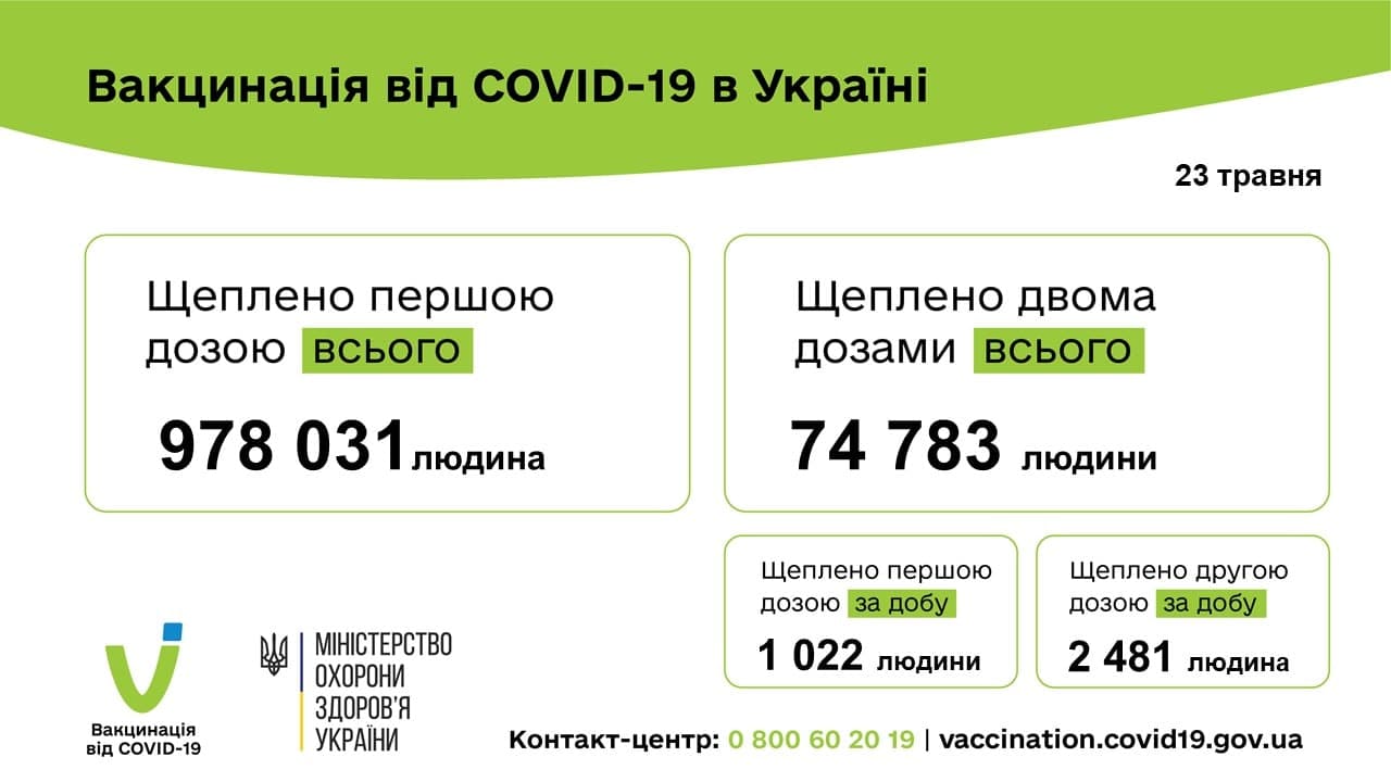 Протягом минулої доби, 22 травня, в Україні проти COVID-19 щеплено 3 503 осіб. Напередодні щеплення зробили 17 583 особам.