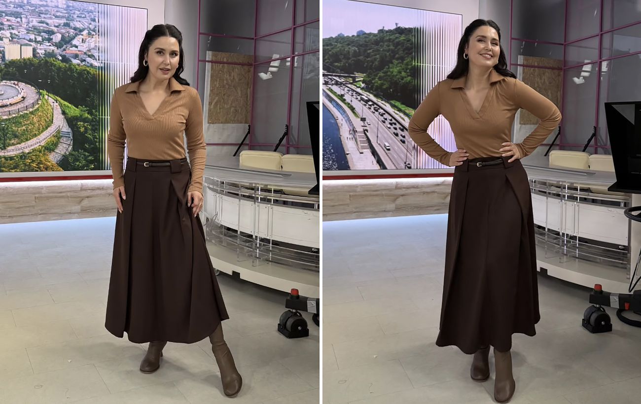 Людмила Барбір з’явилася в ефірі у шоколадному "луці", що підкреслює фігуру та витонченість образу. Її стиль відповідає тренду на "тиху розкіш" і підходить для весняних виходів у світ.