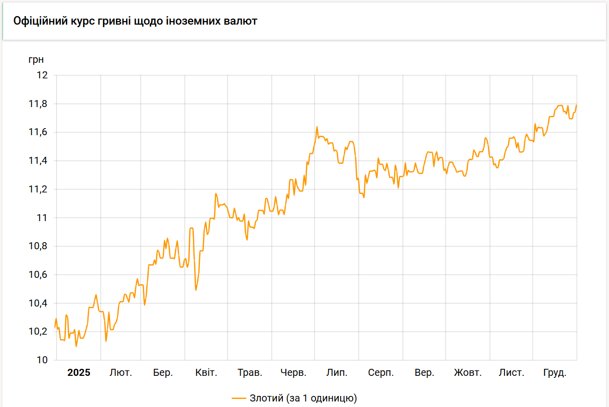 Офіційний курс польського злотого на 31 грудня 2025 року встановлено на такому рівні: 11,7963 гривень за 1 злотий (+0,05 гривень порівняно з попереднім днем).