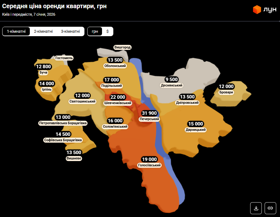 При цьому ціни на оренду дуже відрізняються у різних районах Києва. Найдорожче житло у Печерську, де однокімнатні квартири за 31 900 гривень, найдешевше у Деснянському району. Тут середня ціна на таке житло – 9 500 гривень.