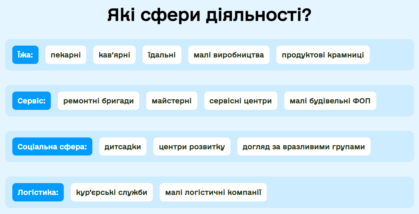 Тепер отримати допомогу в межах програми зможуть також підприємці, чий основний КВЕД відповідає різним категоріям наведеним нижче.