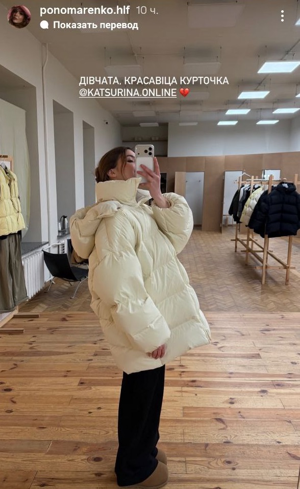 Ірина обрала об’ємний пуховик у ніжному молочному відтінку від бренду KATSURINA. За словами стилістів, ця куртка поєднує у собі комфорт ковдри та архітектурний крій, що робить її універсальною для будь-яких холодних днів.