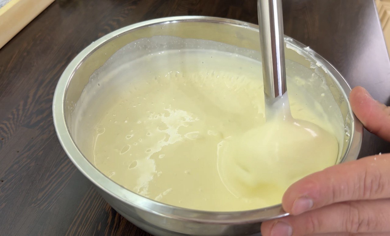 Після цього влийте вершки і ретельно перебийте блендером до однорідної маси.
