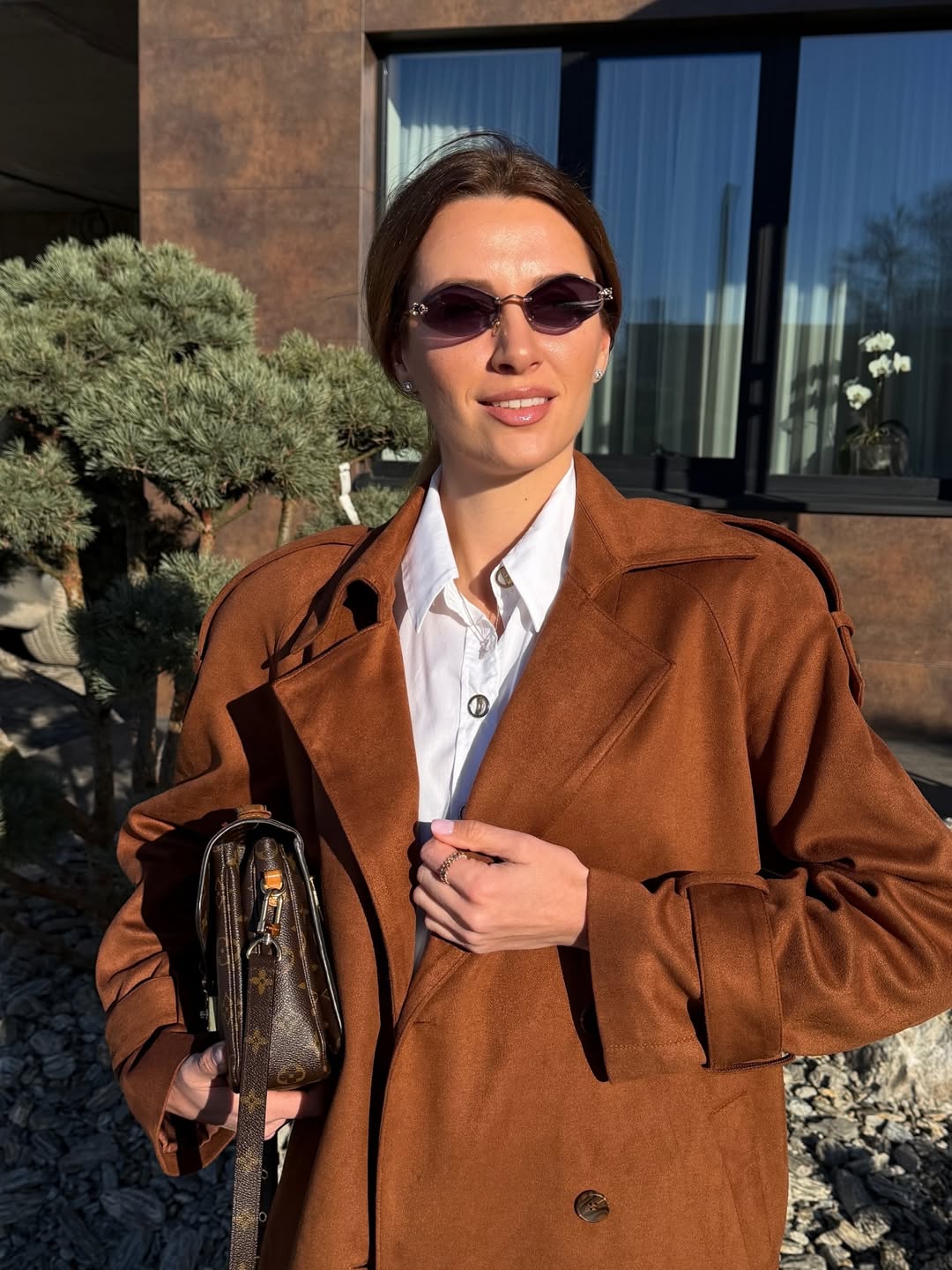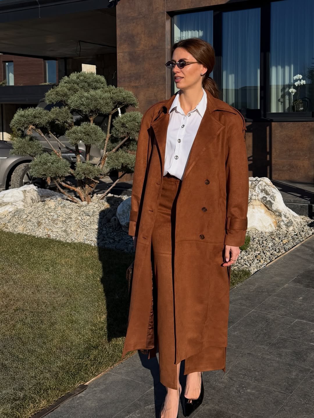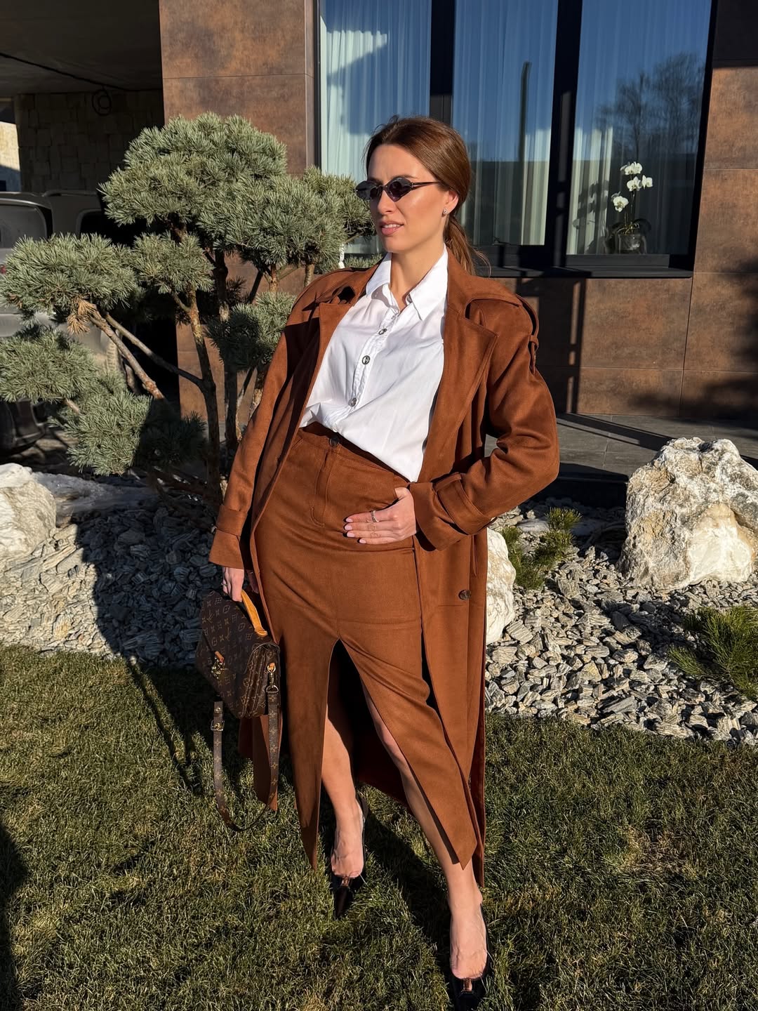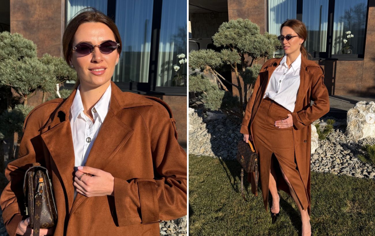 Базою образу став костюм із фактурної замші насиченого коричневого кольору. Замша не лише додає статусності, а й робить силует м’якшим і більш жіночним.