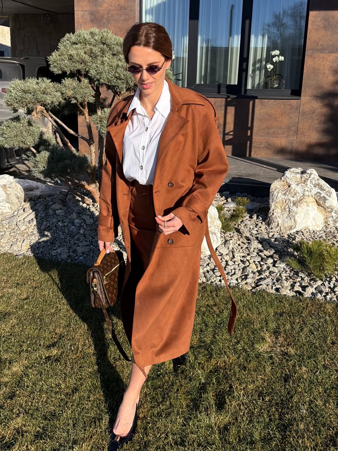 Христина накинула подовжений двобортний тренч вільного крою з помітними ґудзиками. Такий фасон дозволяє комбінувати різні шари одягу, не обмежуючи рухів, і чудово підходить для ранньої весни, коли ще прохолодно.