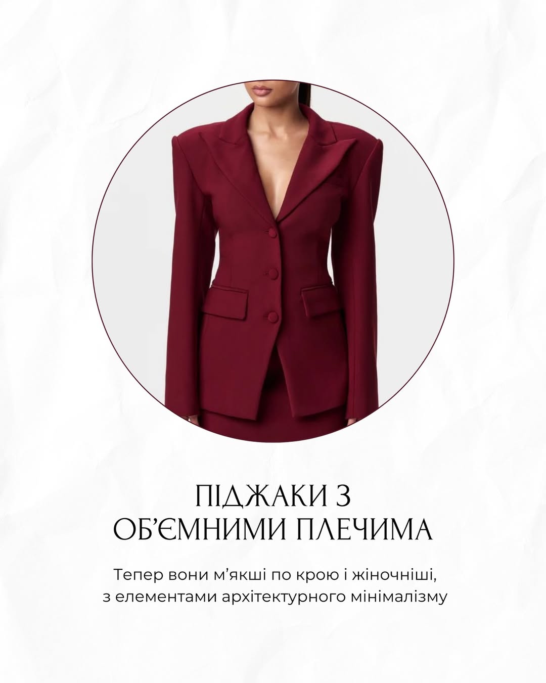 У 2026 році піджаки з об’ємними плечима повертаються у новому вигляді. Вони стають м’якшими по крою, більш жіночними, але зберігають архітектурний характер силуету. Такі моделі легко поєднуються зі спідницями та штанами, створюючи образи, що поєднують строгість і легкість.