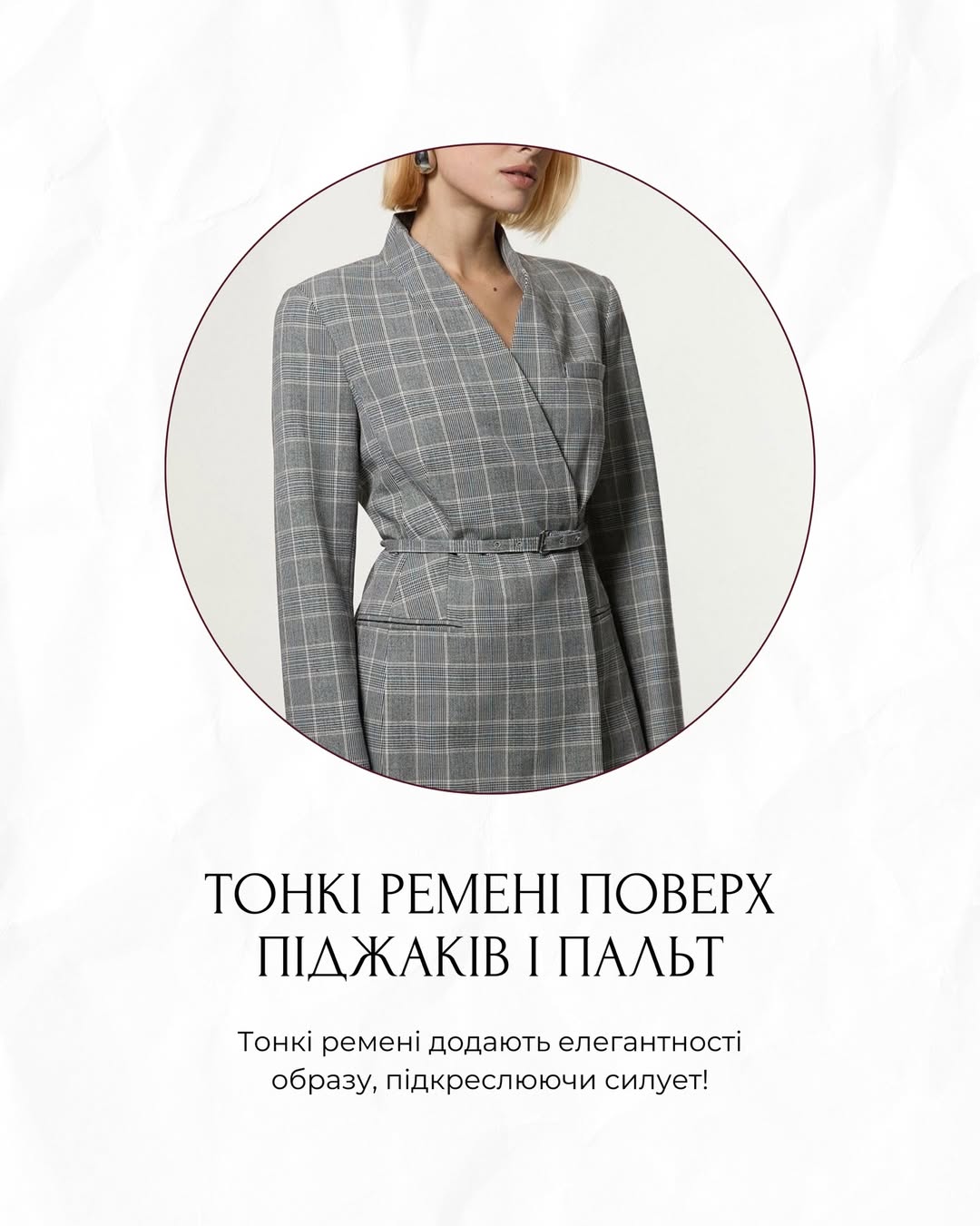 Щоб надати образу елегантності, тонкі ремені використовують поверх піджаків та пальт. Вони підкреслюють талію і створюють завершений силует навіть у строгих моделях. Цей прийом допомагає оживити базові речі та надати образу сучасного вигляду.