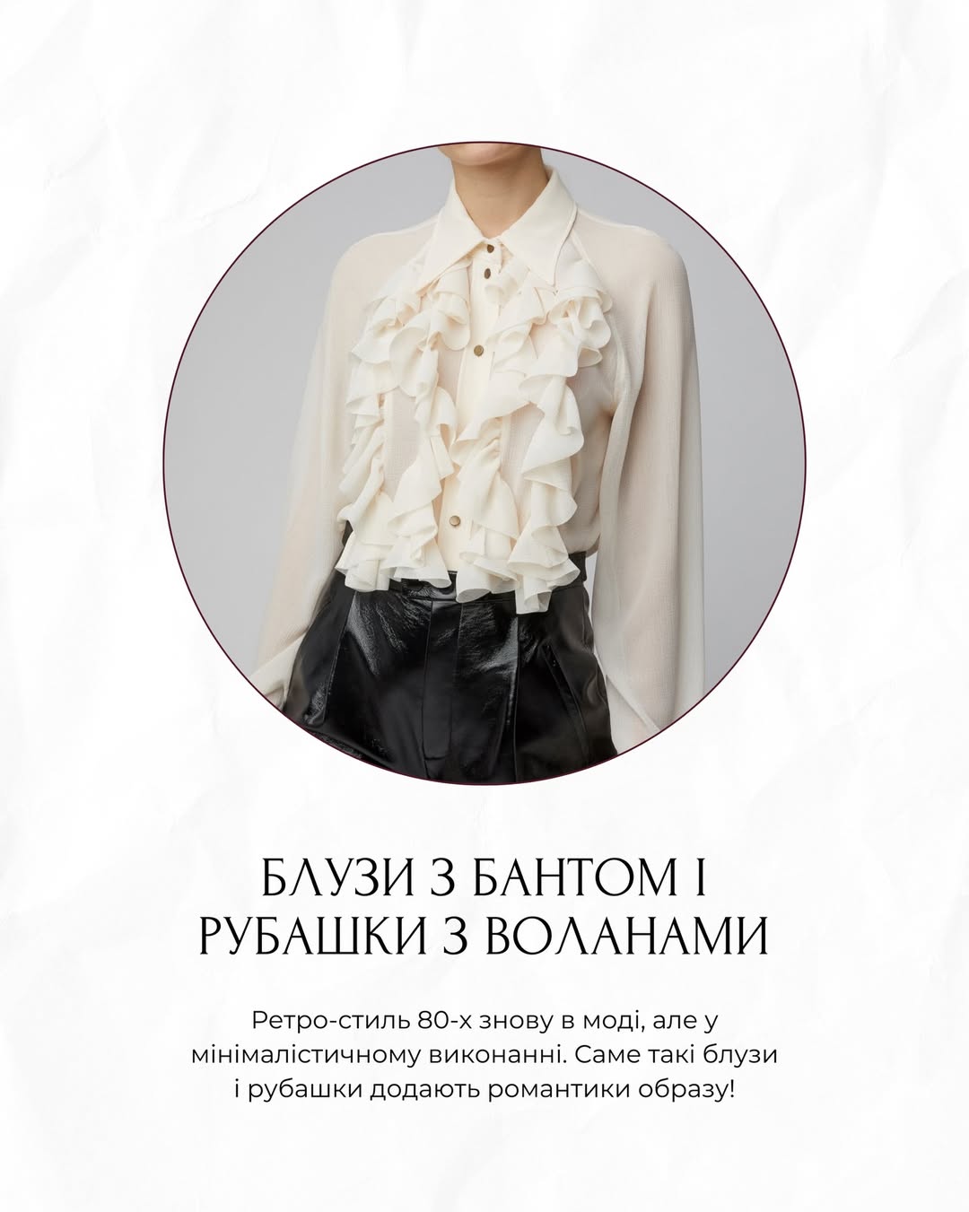 Ретро-стиль 80-х повертається, але в більш мінімалістичному виконанні. Блузи з бантом і сорочки з легкими воланами додають романтики та жіночності. Вони гармонійно поєднуються з джинсами прямого крою або спідницями міді.