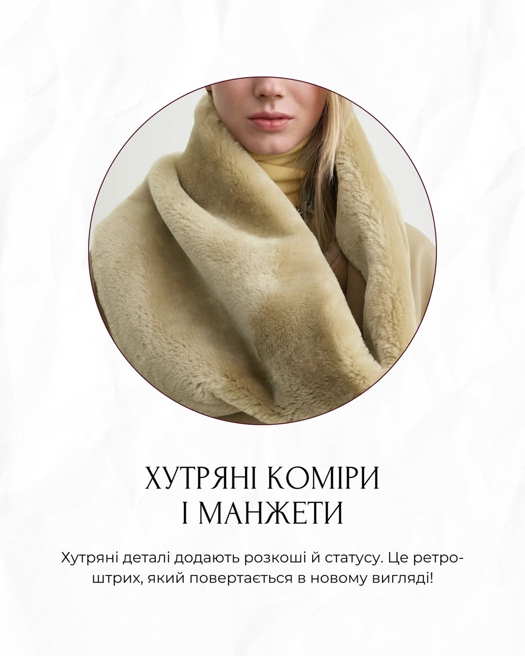 Хутряні деталі на комірах і манжетах повертаються як елемент розкоші й статусу. Такі акценти додають ретро-нотки та водночас виглядають сучасно, особливо у поєднанні з мінімалістичними силуетами піджаків та пальт.