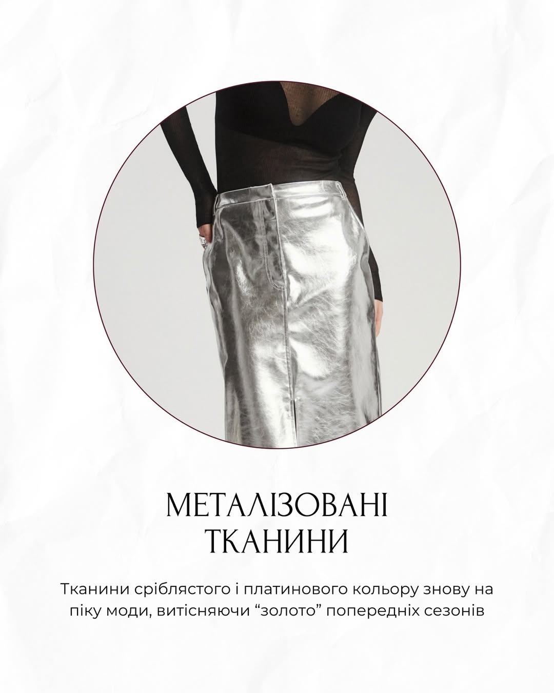 Сріблясті та платинові відтінки тканин знову на піку популярності. Металізовані тканини витісняють золоті тони минулих сезонів, надаючи образам сучасності та легкого футуристичного відтінку.