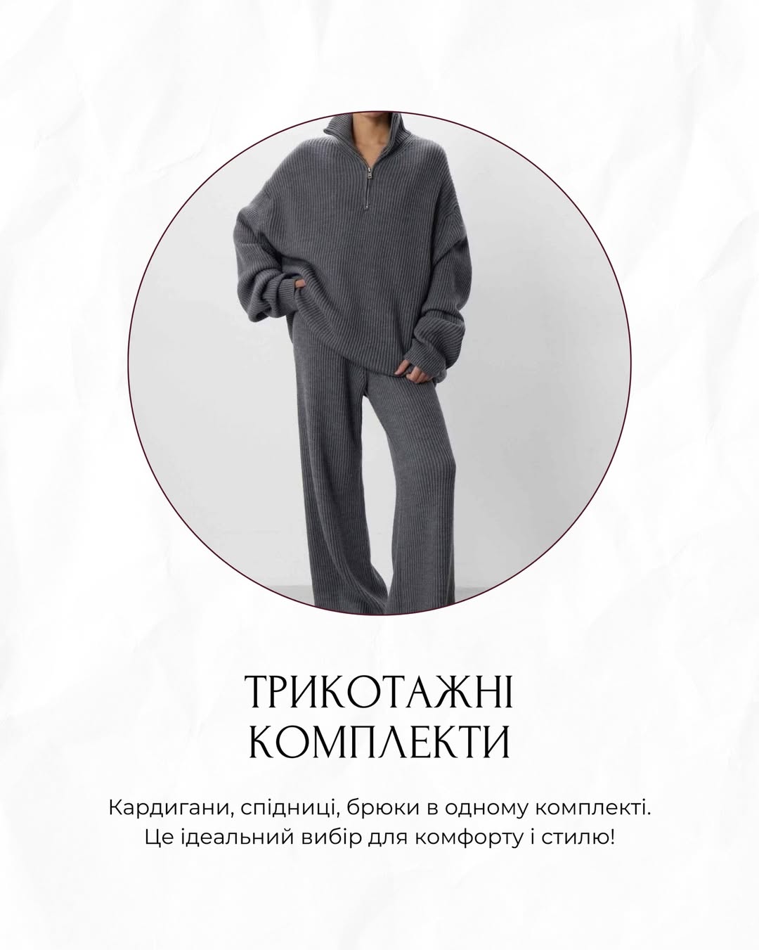 Комфорт і стиль у 2026 році підкреслюють трикотажні комплекти – кардигани, спідниці та штани в одному кольорі або фактурі. Це універсальне рішення для роботи, прогулянки чи домашнього образу, що не вимагає додаткових комбінацій, але виглядає стильно.