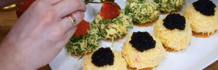 І нарешті – фінальний штрих. Трішки ікри зверху, буквально пів чайної ложки. Не обов’язково багато, просто щоб додати кольору й смаку. Прикрасьте так, як вам подобається.