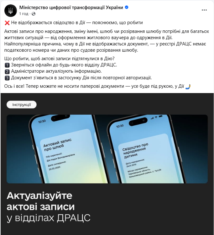 При цьому найпопулярніша причина, чому документ не відображається в "Дії", полягає в тому, що у реєстрі ДРАЦС немає: