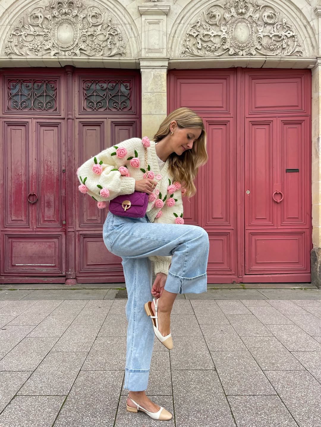 Рожевий кардиган з квітковим принтом поверх блакитної сорочки з великим бантом – ультрамодний прийом у стилі coquette core. Бант додає структури, а квіти на светрі підтримують загальну палітру.