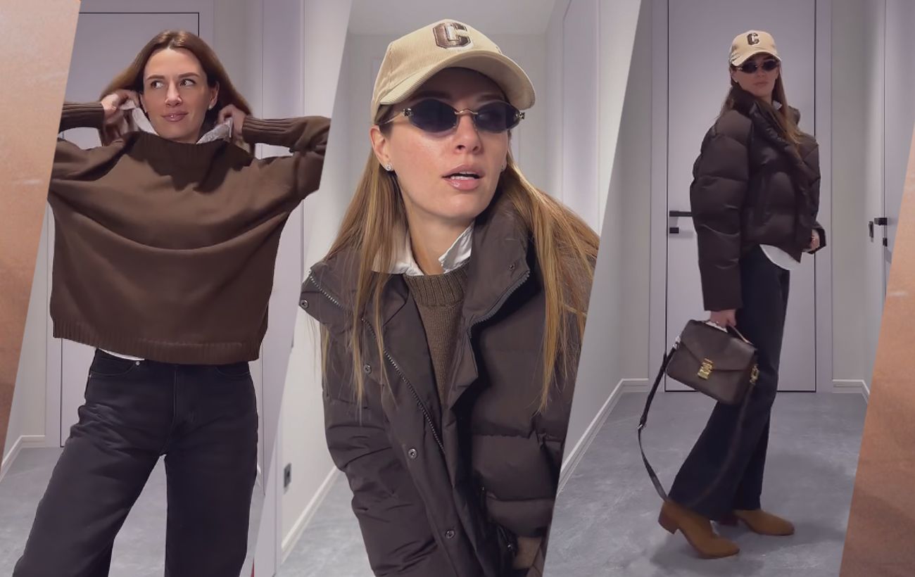 Під пуховик Христина одягла класичну білу сорочку, поверх якої одягнений коричневий джемпер. Білий комірець і край сорочки, що визирають знизу, додають образу акуратності та структури. Такий прийом є перевіреним способом зробити повсякденний образ більш зібраним, навіть якщо він складається з базових речей.