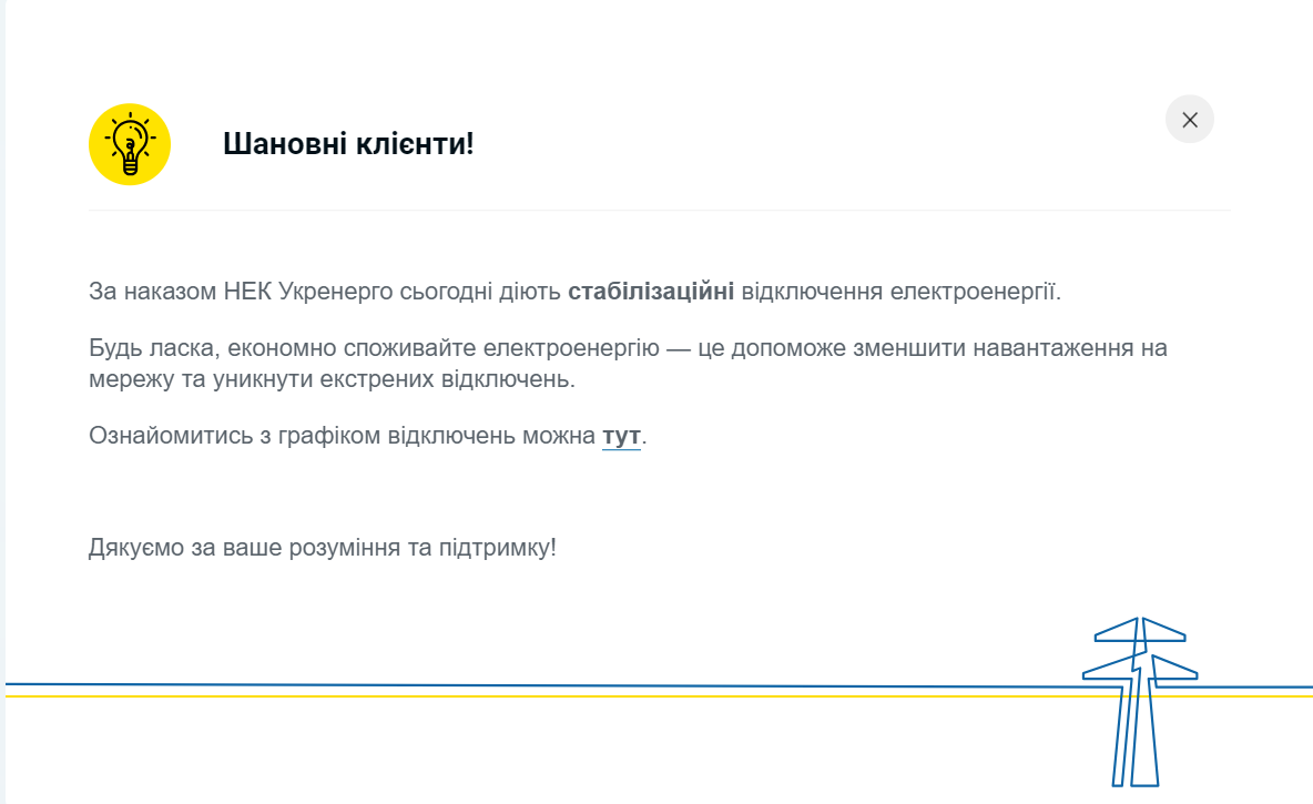 Енергетики закликають громадян із розумінням ставитися до вимушених обмежень і нагадують: графіки стабілізаційних відключень запроваджують для збереження балансу в енергосистемі країни після масштабних атак на енергетичну інфраструктуру.
