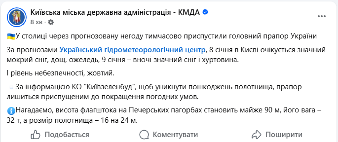 Згідно з інформацією КМДА, головний прапор України у четвер (8 січня) приспустили через прогнозовану у столиці негоду.