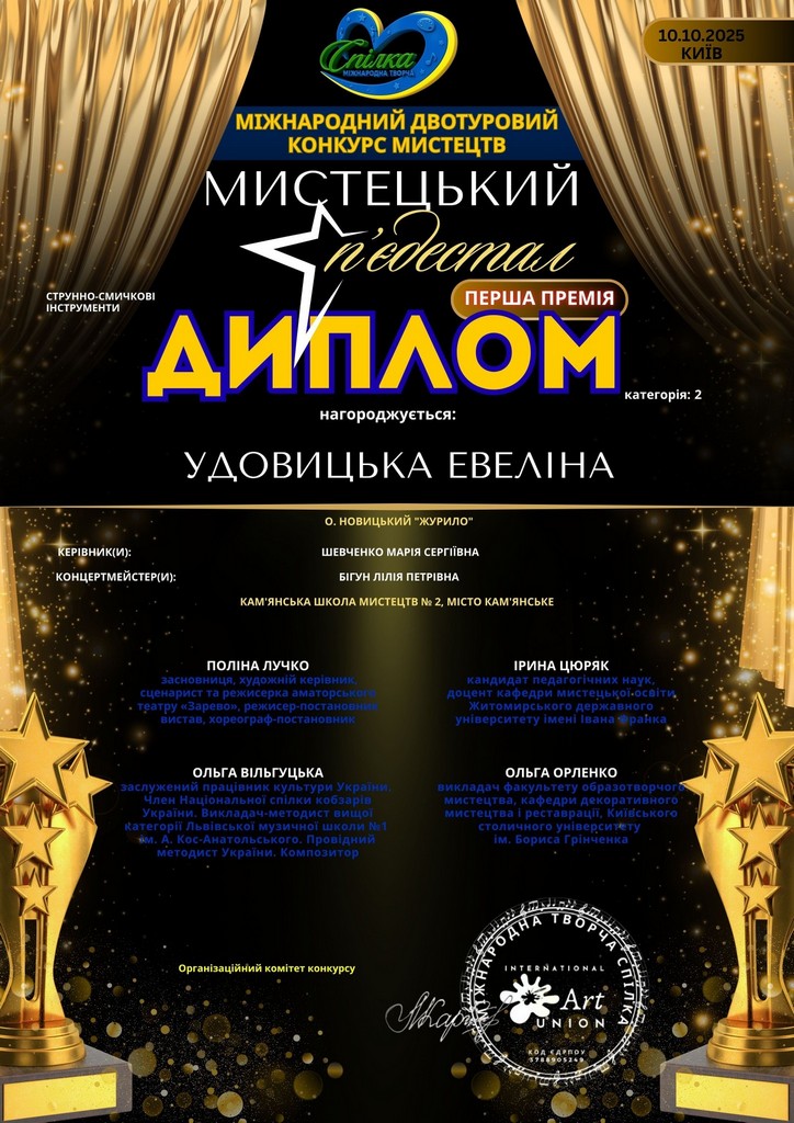 Юна скрипалька, талановита учениця Кам’янської школи мистецтв № 2 Евеліна Удовицька взяла участь у Міжнародному двотуровому конкурсі мистецтв “Мистецький п’єдестал”, що відбувся 10 жовтня у Києві. Організатором виступила міжнародна творча спілка Art Union.