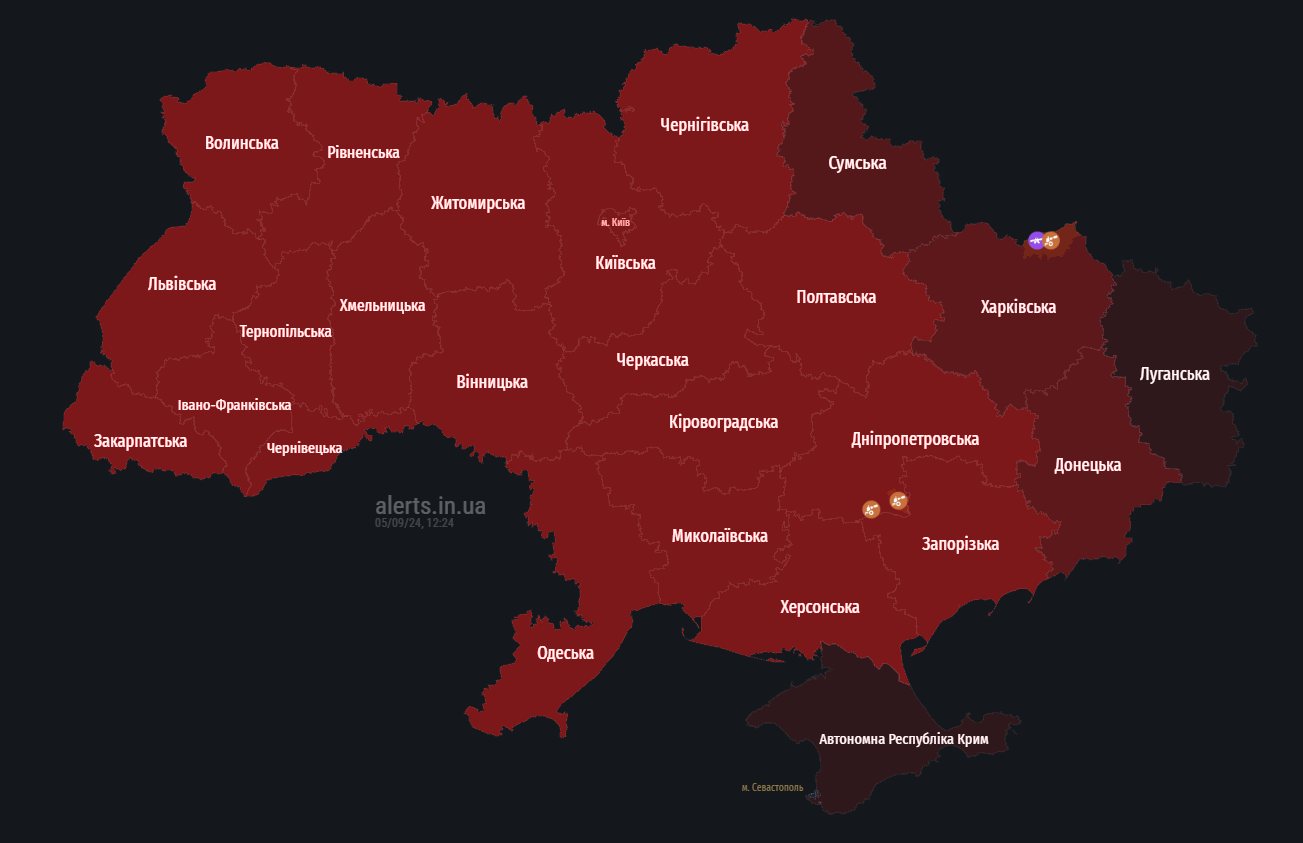 Станом на 12:20 повітряну тривогу оголошено по усій території України.