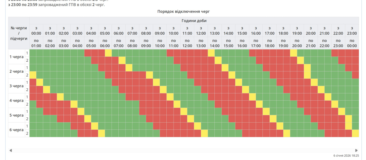 - з 00:00 до 06:00 години – електрику вимикатимуть для 0,5 черг;