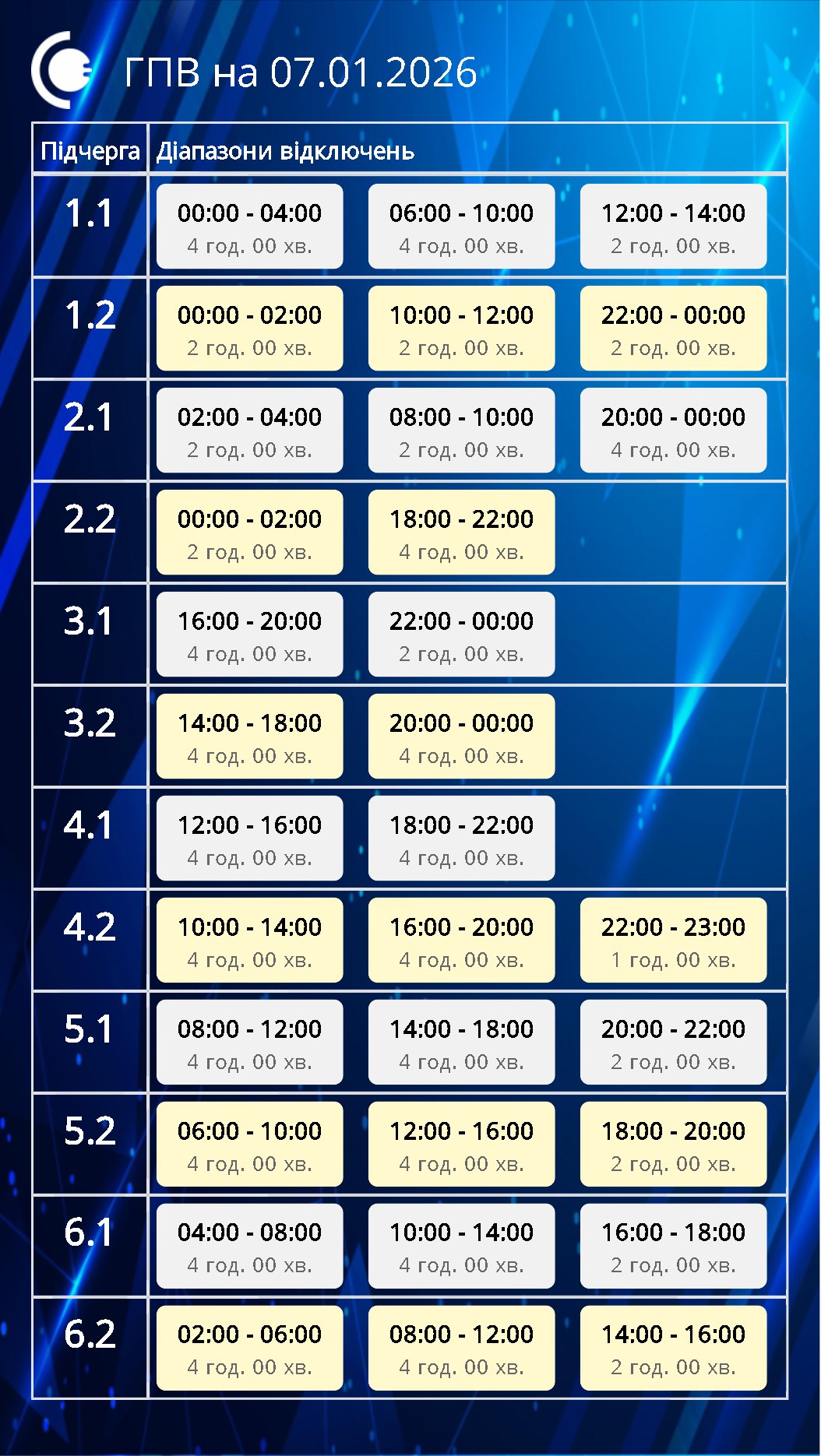 - Черга 4.1: 00-02, 08-10, 12-14, 16-18, 20-22