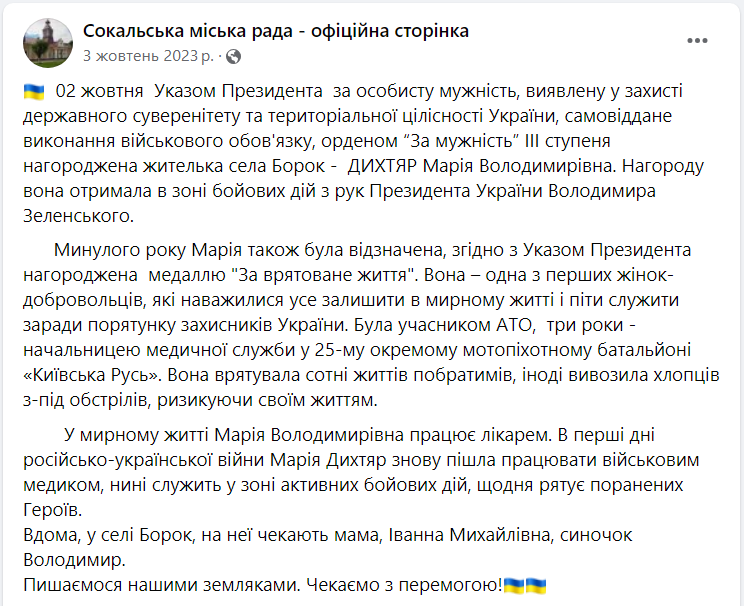 Публікація Сокальської міської ради (скриншот: facebook.com/Сокальська міська рада – офіційна сторінка)