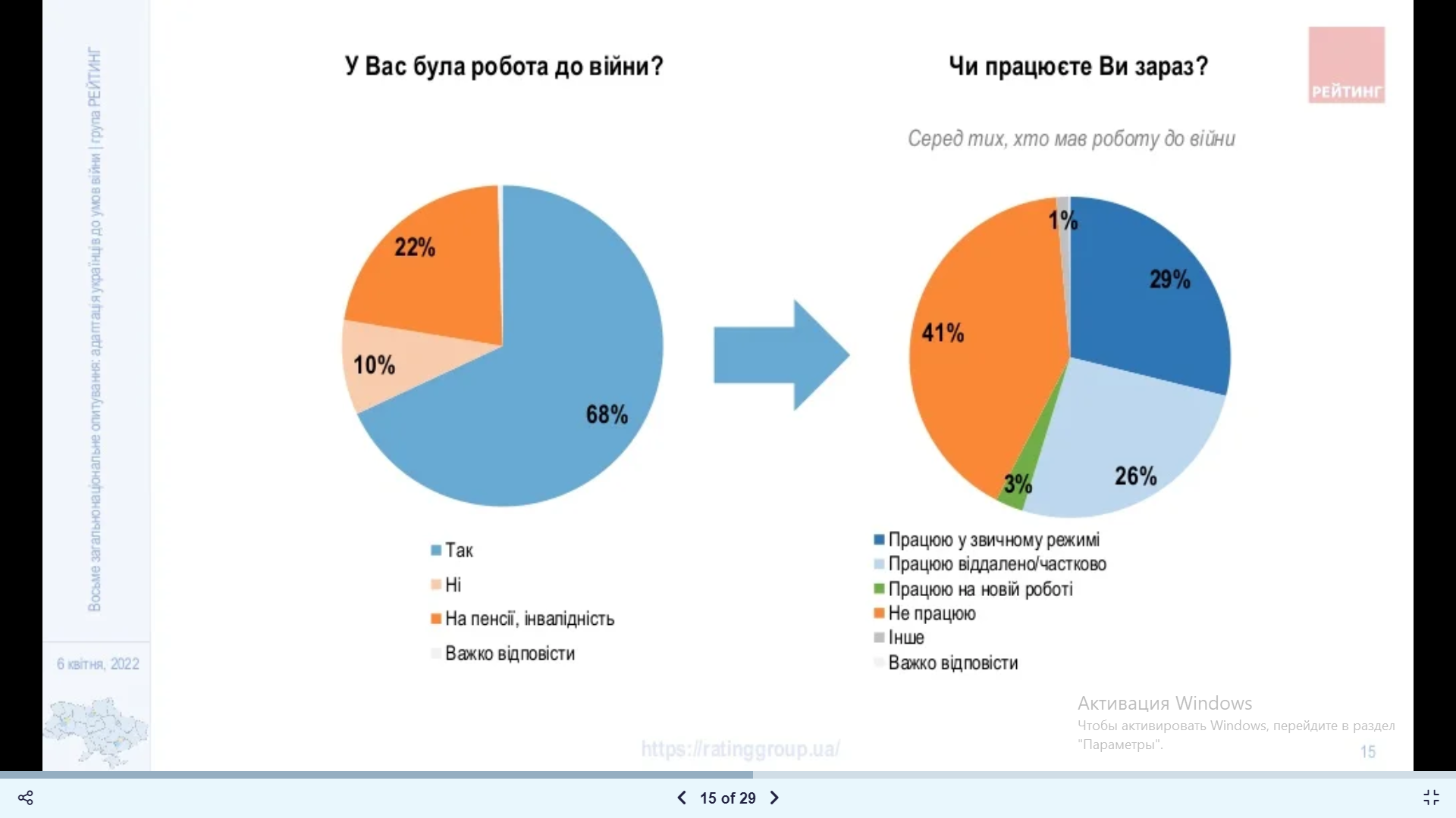 В цілому 29% працюють у звичайному режимі, 26% – частково або віддалено, 3% – почали працювати на новій роботі.