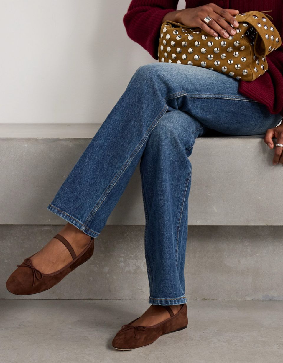 Коричневі замшеві балетки стають ідеальним рішенням для весни та осені. Вони додають образу затишку і невимушеності, особливо якщо джинси злегка підкочені або мають прямий крій.