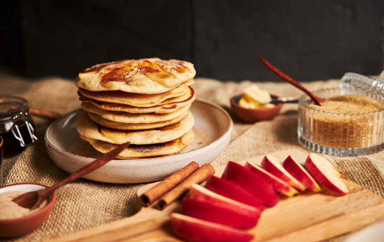 3 яйця, 400 мл кефіру 2,5%, 250–270 г борошна, 100–150 г цукру (залежно від кислоти яблук), 1,5 ч. ложки розпушувача, дрібка солі, 4 середні яблука й трішки олії або масла гхі для смаження.