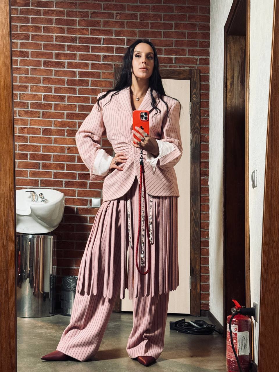 Другий образ: рожевий костюм у смужку