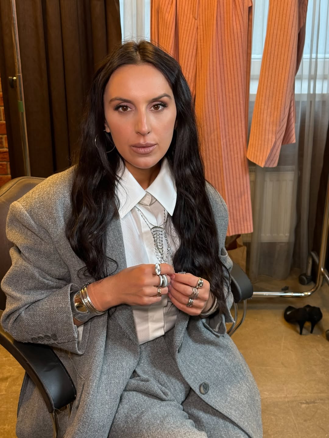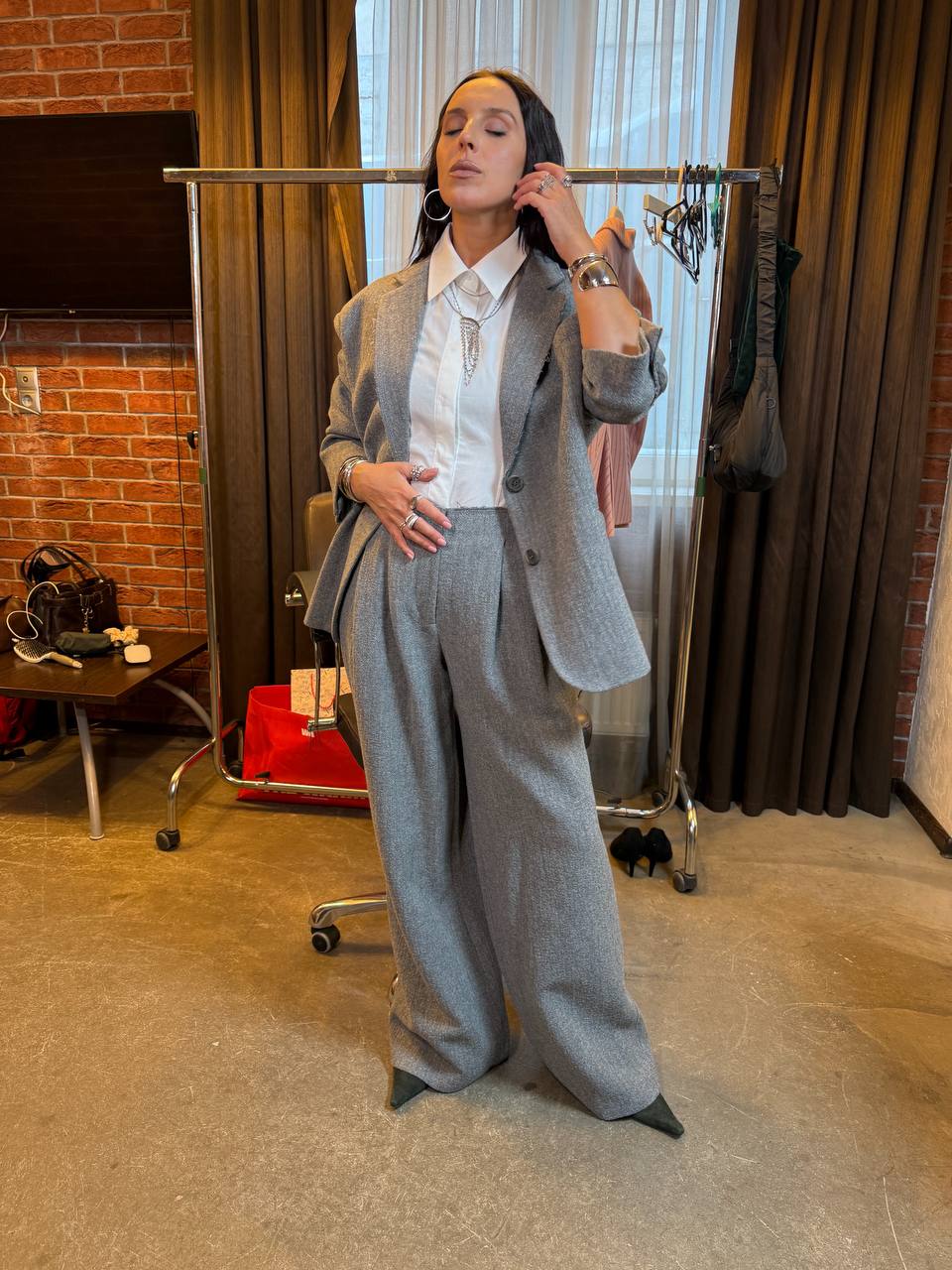 Перший образ: сірий вовняний костюм та акцентні прикраси