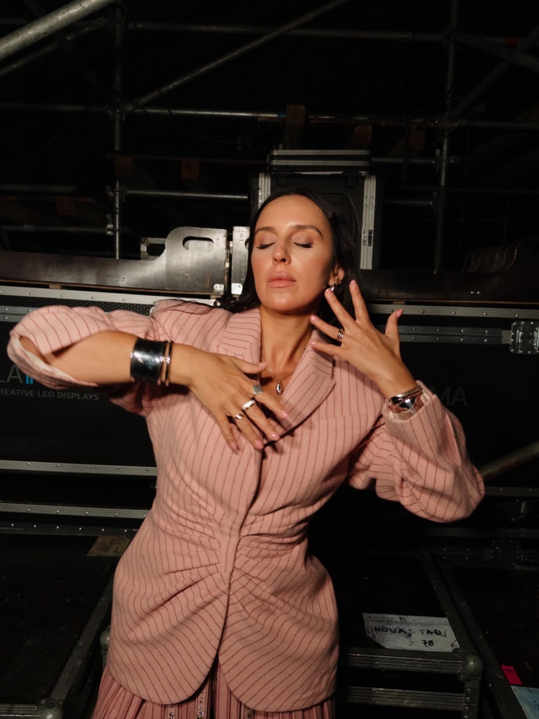 Саме тут розкривається фірмовий стиль Джамали. Масивні сріблясті браслети-манжети, багатоярусне кольє-ланцюг, що асоціюється з сучасною інтерпретацією дукача, та численні великі каблучки створюють відчуття сили й автентичності.