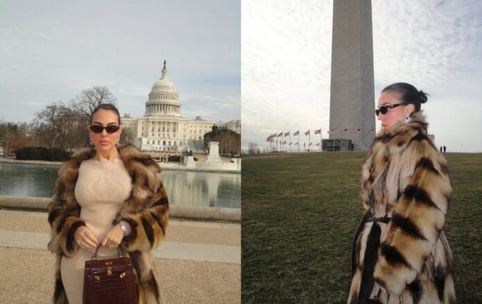 Джорджина часто будує образ на однотонній базі, вибираючи обтислі комплекти під об’ємну шубу. Такий прийом створює довгу, плавну вертикаль, яка візуально витягує силует і робить його гармонійним.
