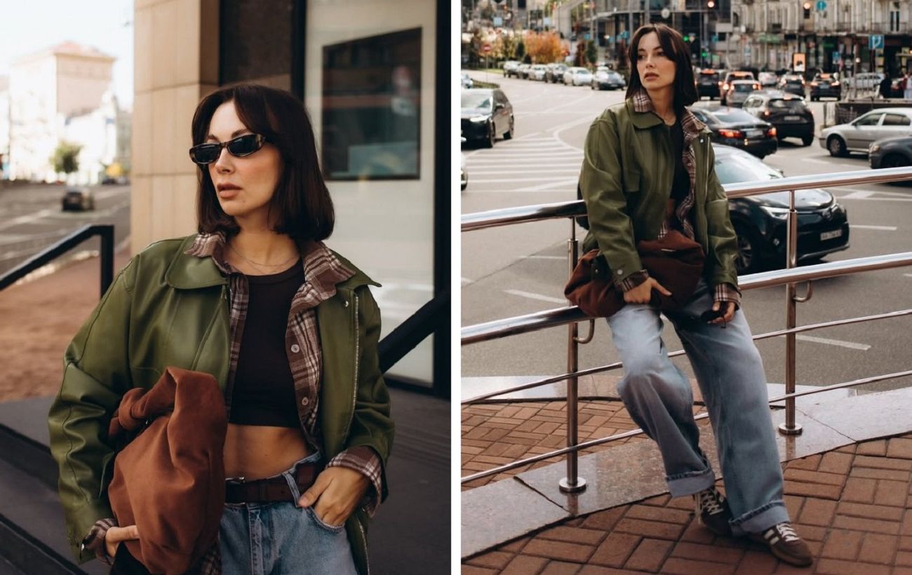 Ключовим елементом образу стала куртка зі шкіри оливкового відтінку. Вільний, злегка оверсайз крій надає образу сучасного вигляду. Такий верхній одяг являє собою поєднання функціональності та естетики, створюючи стильний акцент.