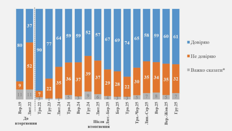 Водночас соціологи фіксують позитивну динаміку протягом останніх тижнів. Так, серед опитаних наприкінці листопада (26–30 листопада) Зеленському довіряли 49% громадян, тоді як у грудні (1–13 грудня) цей показник зріс до 63%.