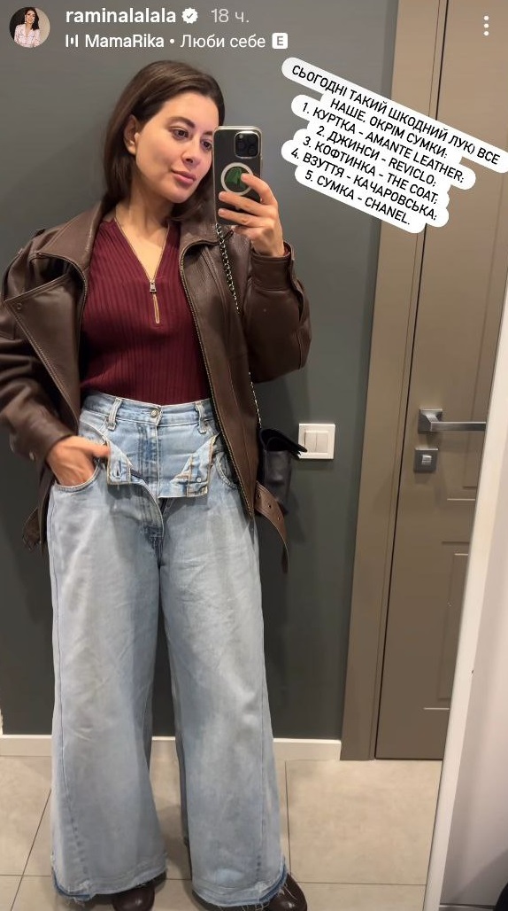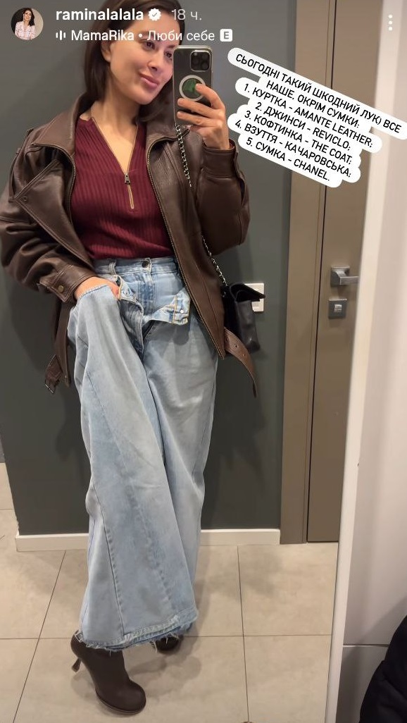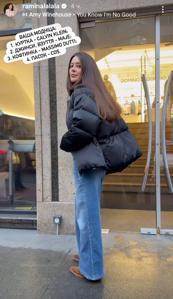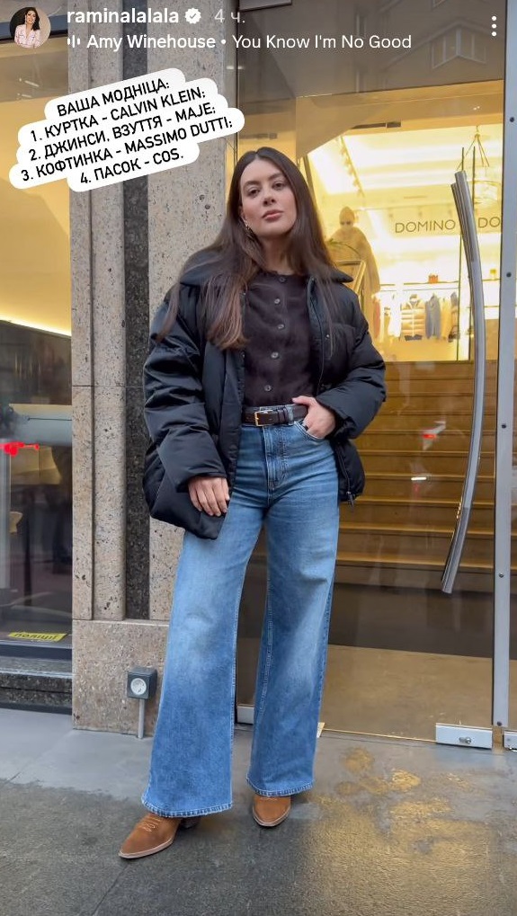 У першому варіанті Раміна робить ставку на комфорт і практичність. Світлі широкі джинси з високою посадкою стають основою образу, а теплий пуховик і лаконічний трикотажний верх формують щоденний гармонійний лук.